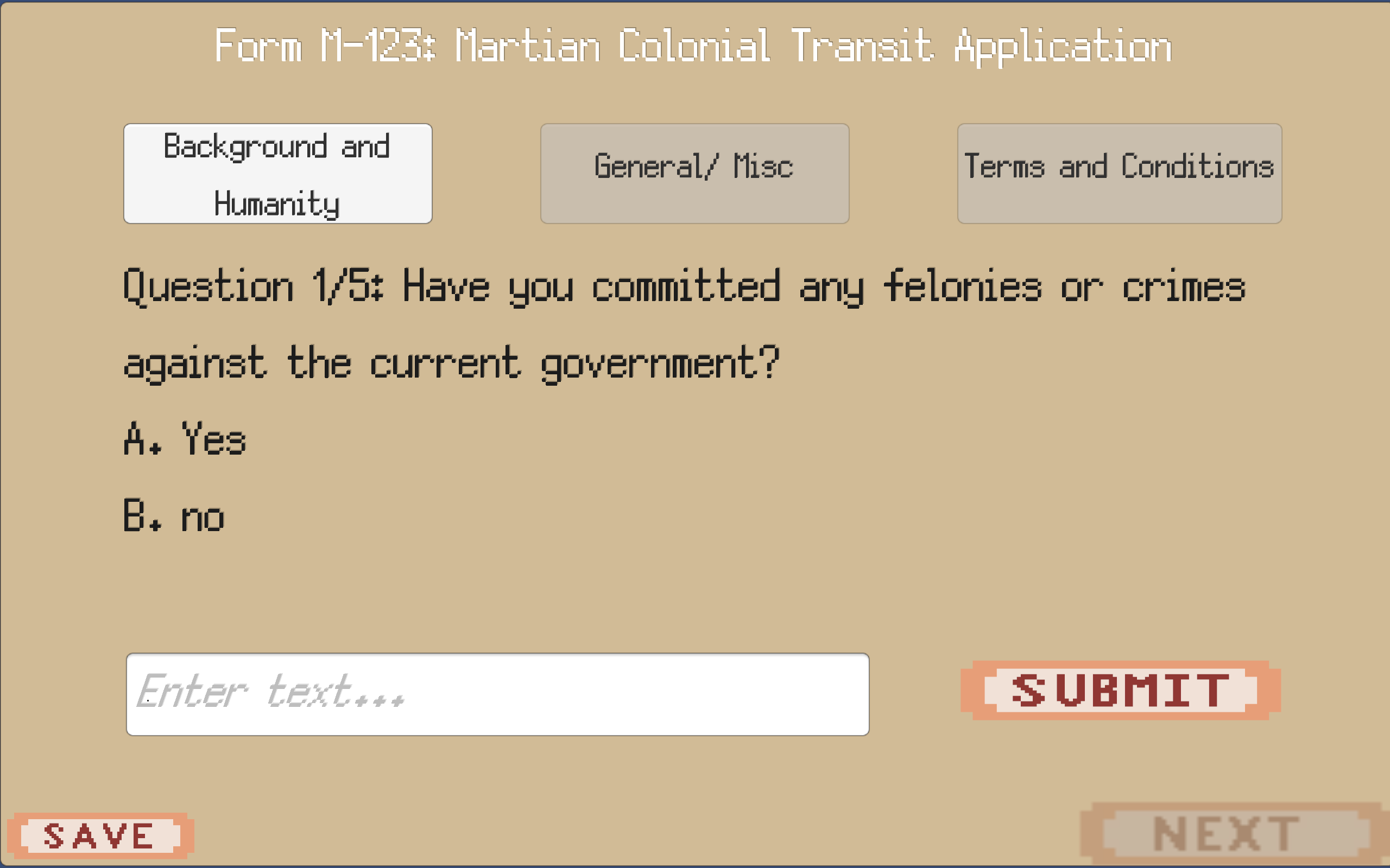 You play as a robot on Earth who is going through the legal process to immigrate to Mars. You have to fill out the immigration paperwork and get a certain number of questions correct in order to pass.